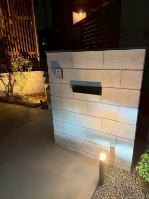 門柱はCBブロックをウマ目地で積むことで、シンプルですが、動きのあるかっこいい門柱になります。