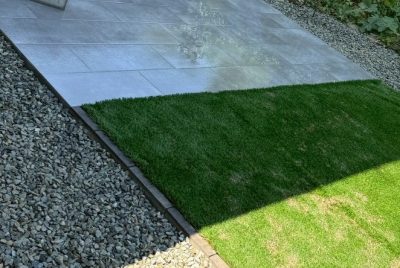 お庭は、RIVIERAの300*600タイル貼りと人工芝