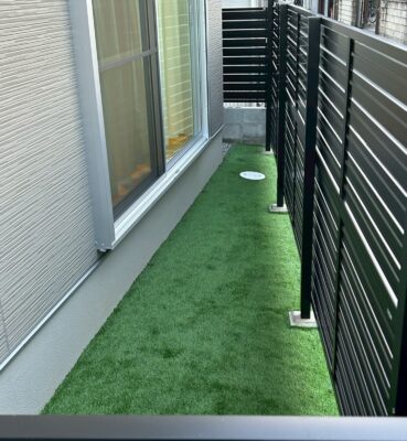 目隠しをしたお庭には、人工芝を。